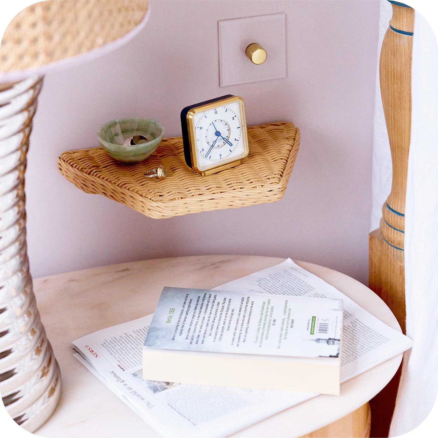 Clockwise from top left: Notebook, Smythson; Roberts Radio, Ebay; Rattan Waste Paper Bin, MG&Co.; Alarm Clock, Bage & Soner; Tray, Dar Leone; Oval Mirror, MG&Co.; Ottolenghi Cookbook; Wall Clock, Newgate; Rattan Shelf, MG&Co.